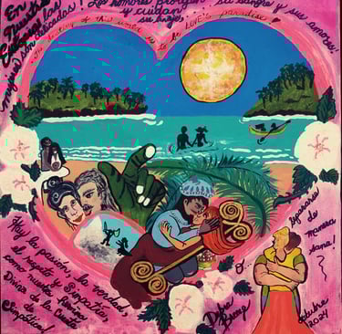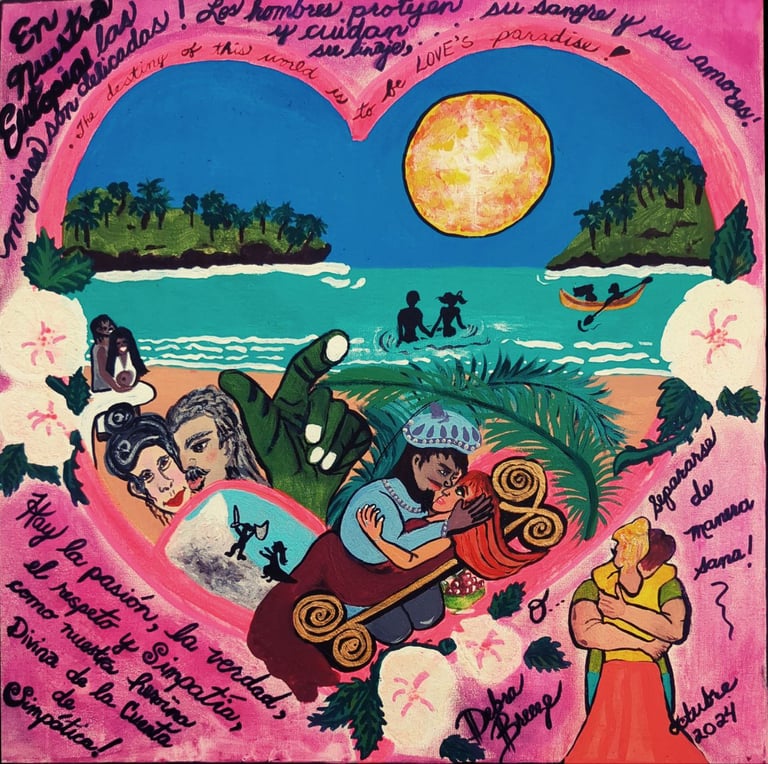 Many of the vignettes in her paintings, Debra witnessed in real life; the young man holding his baby still in mama's belly as the breeze blew her dress.