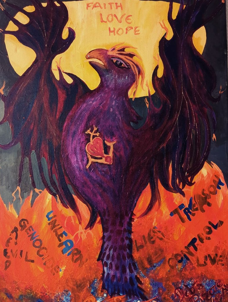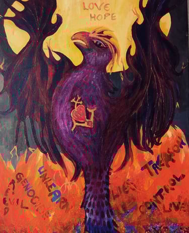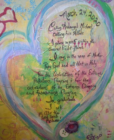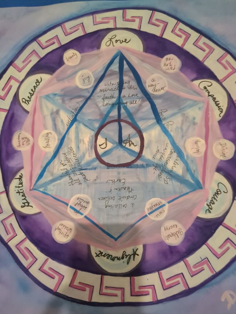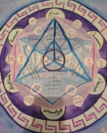 The Metatron Cube Series is comprised of the flower of life containing 6 virtues Debra lives by. She makes this painting an annual event, when the time is right. 2021 was tumultuous so it is skipped.