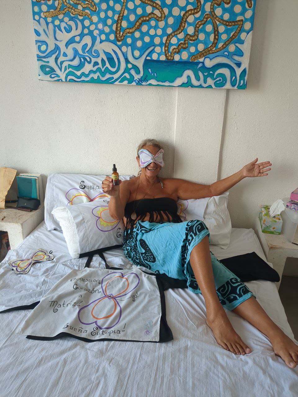 Le piece de resistance! We all are dreaming about peace! Hold Debra's painting of Community or Animal Welfare or Love in your mind's eye and relish what your Eutopia would be? Her infinity sign of copper protects from unwanted emf's, and rose quartz in the diamond purifies the pineal gland to create a solid night sleep in the dark. Washable.