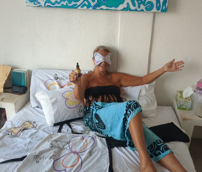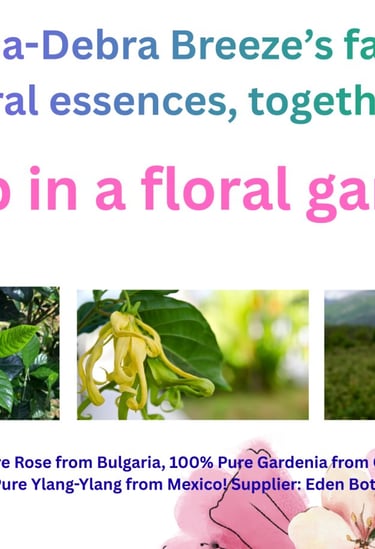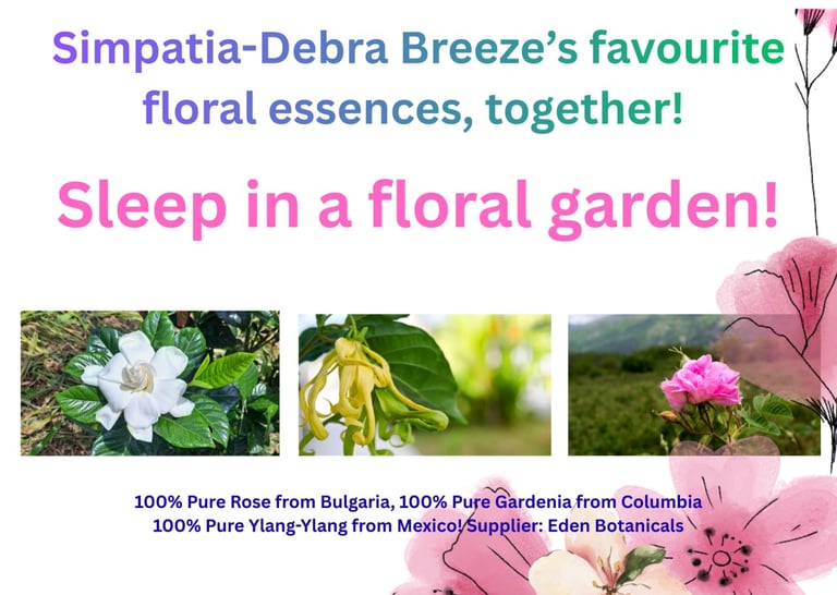 For Debra Breeze, the search for pure and organic flower essences that God gave us with which to enjoy our olfactory sense is a return to innocence! Simpatica's concoction of Gardenia, Rose and Ylang Ylang, is the climax of this sleep-scape. Rose and Gardenia are known to open up the heart chakra! Now add chimes in the wind, or ocean waves to lull you to sleep...Remember, a little dab will do ya! This concoction is designed intuitively by Debra's alter-ego, her heroine, Simpatica!