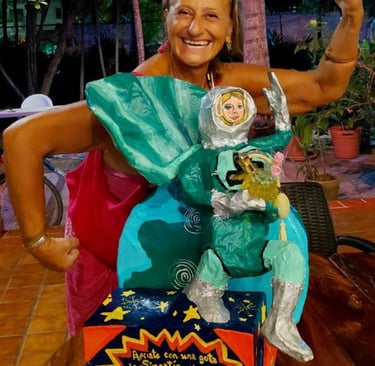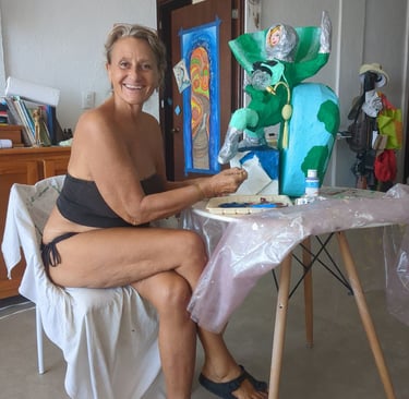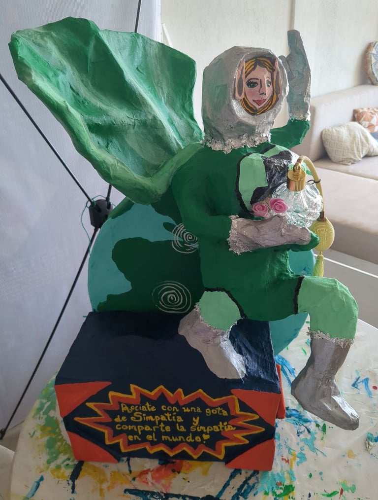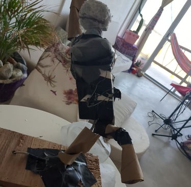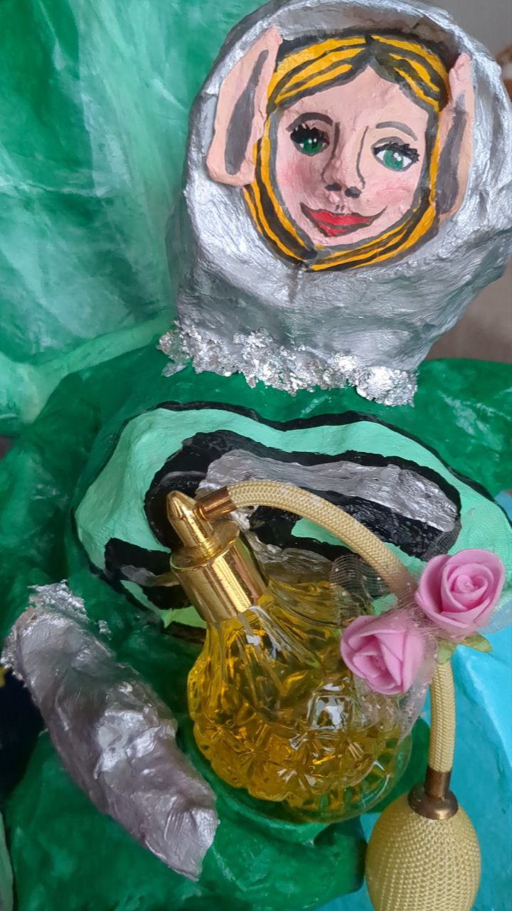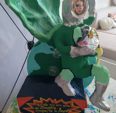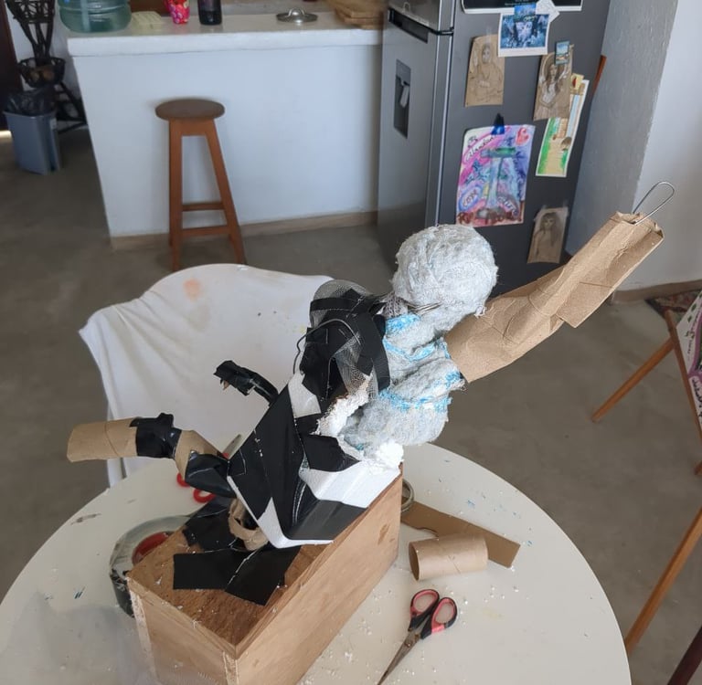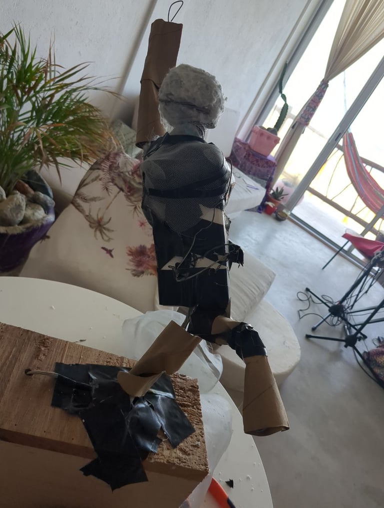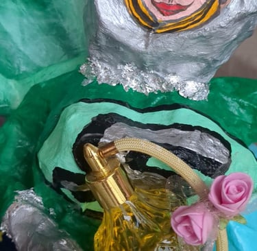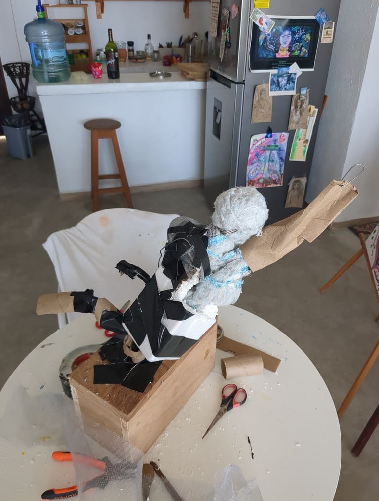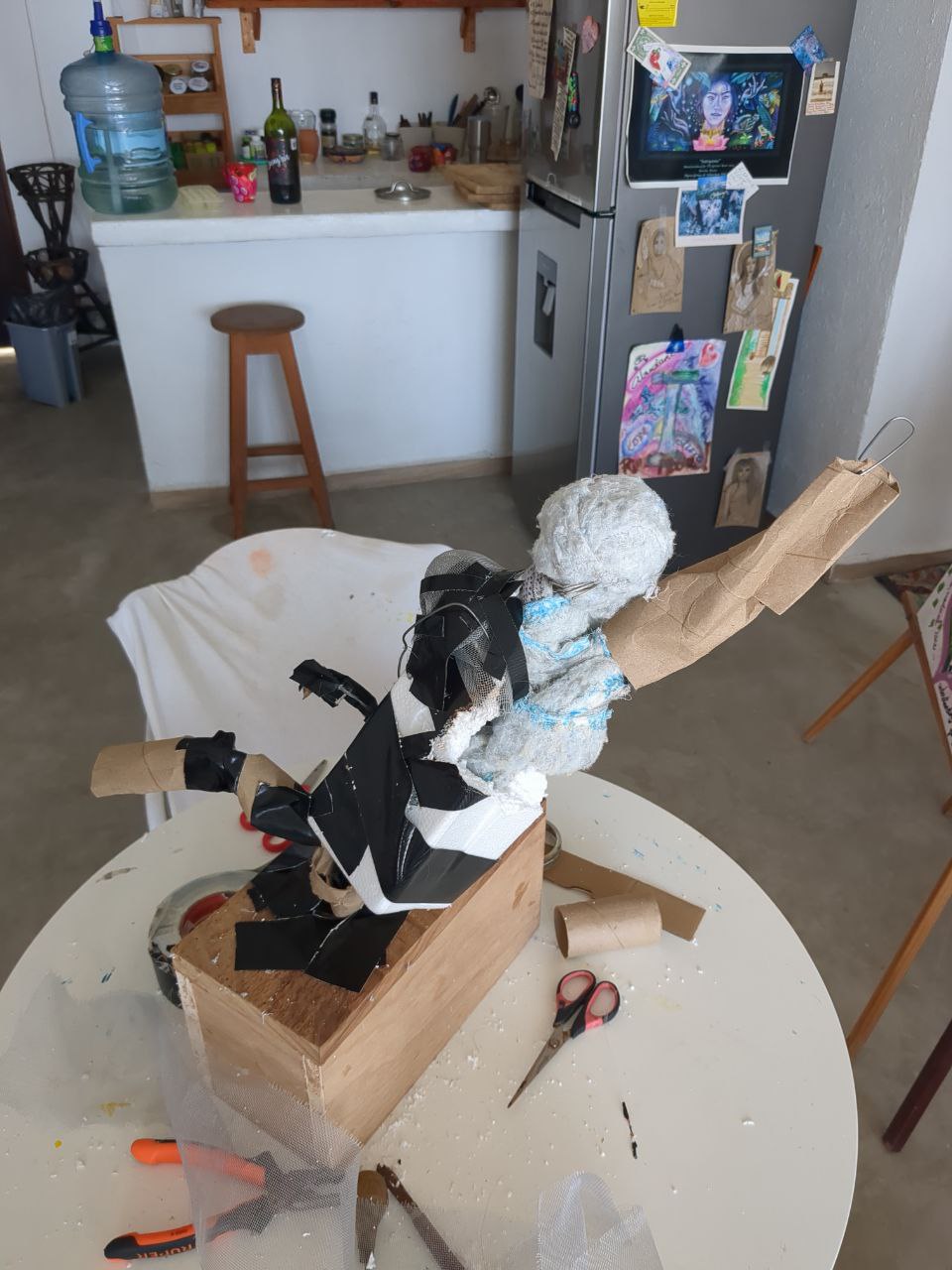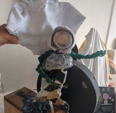 My heroine is made from wire, rope, styrofoam, ball of cotton, mesh, wood, paper mache (white glue and water of equal parts til slimy), cardboard, hand drum, glass, ric rac